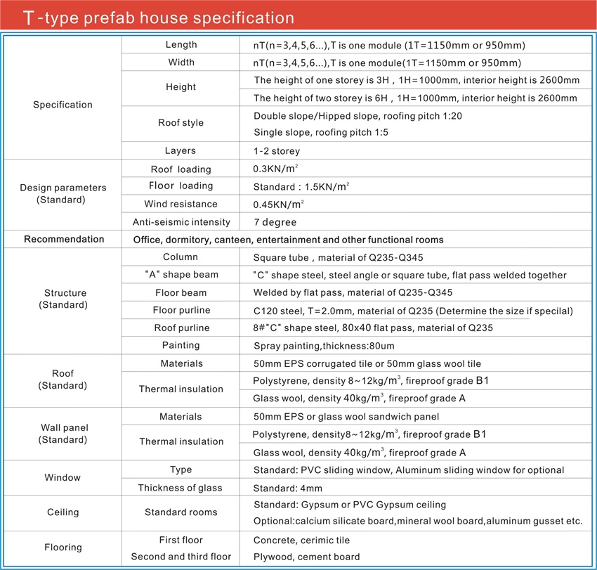Convenient storage and transport----few types of components, convenient for storage, high transport efficiency, a 40HQ container can load about 300 square meter flat roof of T-type house.